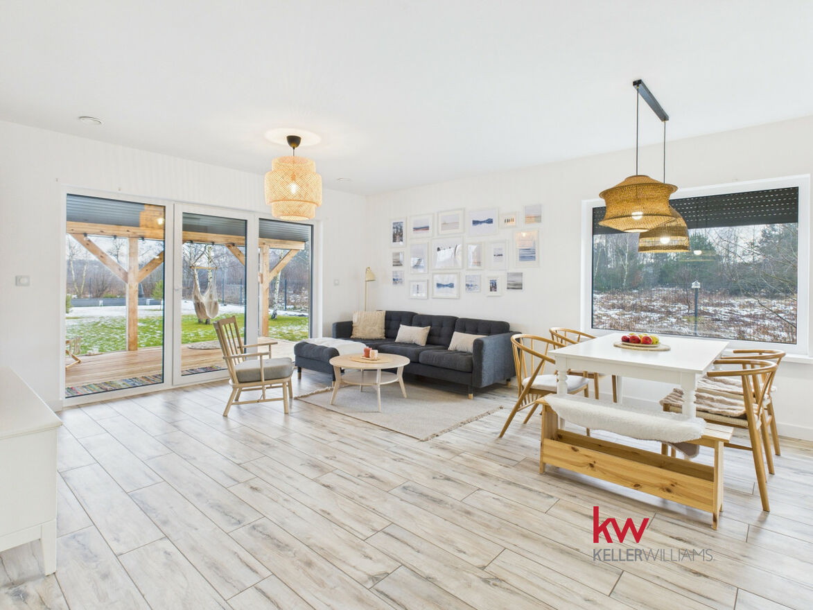 Standard: dom gotowy do zamieszkania, jasne i spójne wykończenie w stylu nowoczesnym (biel, drewno, czarne dodatki)