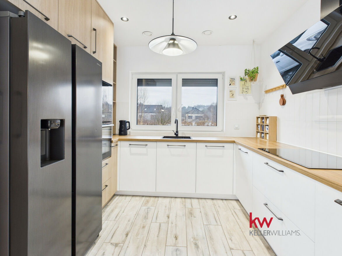 Kuchnia w zabudowie: biało-drewniane fronty + drewniane blaty, czarne detale i dużo blatu roboczego.